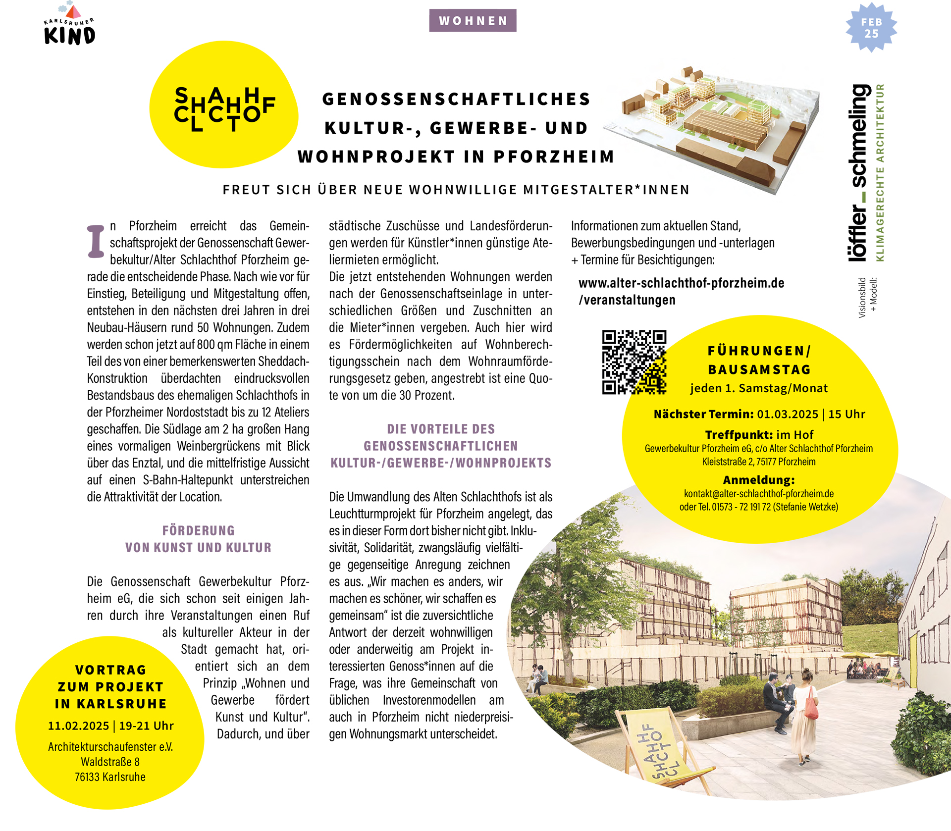As part of the "GEMEINSAM - Wie möchte du wohnen?" exhibition, we were able to showcase the co-operative project around the Alten Schlachthof Pforzheim vorstellen. Hier entsteht ein Quartier für gemeinschaftliches und bezahlbares Arbeiten & Wohnen sowie Räume für Kunst und Kultur. Die Umsetzung sozialer, kultureller und ökologischer Ziele ist ökonomischen Bestrebungen übergeordnet, so schaffen wir ein hohes Maß an Lebensqualität und können Wohnraum für inklusives und barrierefreies Wohnen anbieten.