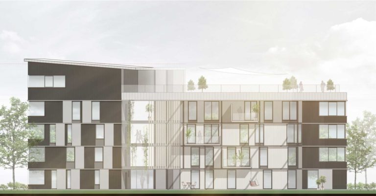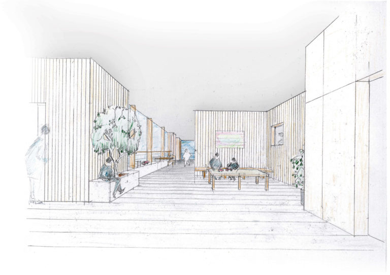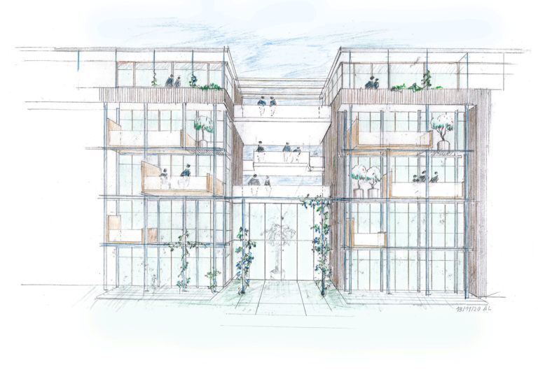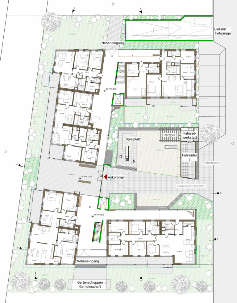 Die Gemeinschaftsflächen, wie Gemeinschaftsraum, Terrasse, Hauswirtschaftsräume, Wintergarten, Co-Working Spaces, Gastwohnung und Flächen für Urban-Gardening, befinden sich im Dachgeschoss. Damit wird sowohl die Wertigkeit dieser Gemeinschaftsflächen sichtbar, als auch eine Flexibilität und Anpassbarkeit der Bereiche an wechselnde Bedürfnisse ermöglicht.