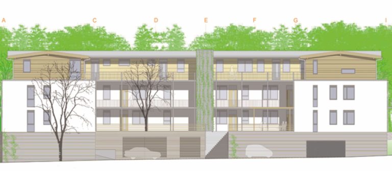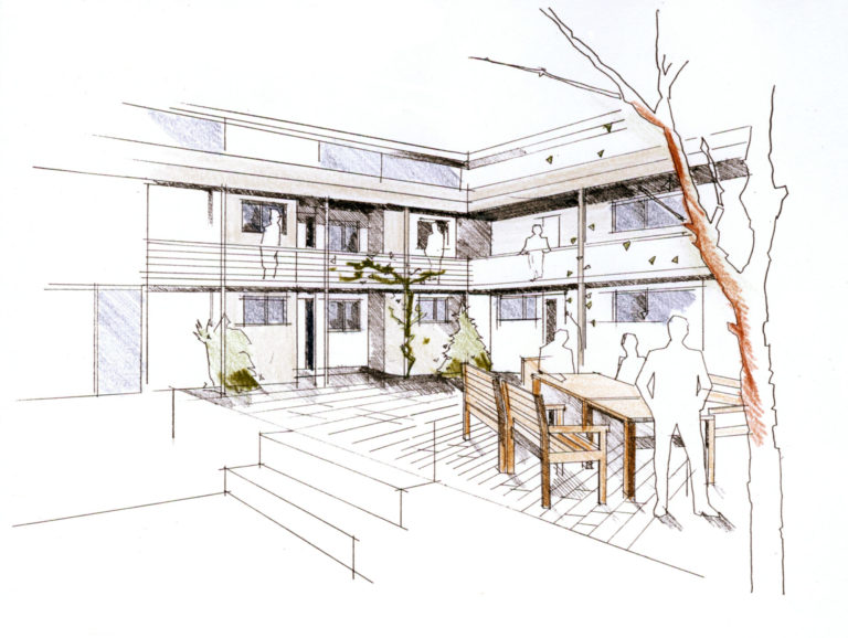 Entstanden ist VIA aus einer Zukunftswerkstatt der Rastatter Volkshochschule Ende 1999. VIA – Vital im Alter – ist zwischenzeitlich ein generationenverbindendes Projekt geworden, das ein Grundstück in Baden-Baden in Option hat. Das Ziel ist eine Mischung mehrerer Generationen aus Familien, Singles, Paaren und Alleinerziehenden. Der Wohnhof liegt, da das Gelände stark steigt, etwa drei Meter höher als die Straße. Er wird über eine große Freitreppe, einen Aufzug oder von der westlich liegenden Straße erschlossen. Der Hof ist von drei Seiten durch Bebauung geschlossen und öffnet sich zum Tal hin als große Freiterrasse mit schönem Ausblick. Diese Kante ist räumlich mit einer Pergola gefasst, an der auch der Gemeinschaftsraum liegt, so dass hier Begegnung und Feiern seinen Platz hat. Der Hof ist praktisch der „Marktplatz“. Von hier geht man dann über Aufzug oder Treppen in die oberen Geschosse, wo die Wohnungen über Laubengänge erschlossen sind.