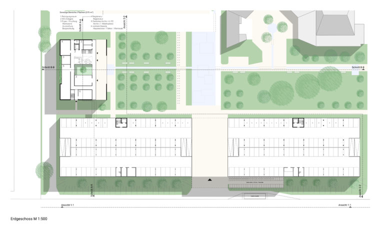 An der vielbefahrenen Straße platzieren wir ein Signet. Eine intensiv begrünte Garage, mit großem Eingangsportal und Haltestelle, hinter dem sich das Quartier der Handwerkskammer als ruhige Oase aufspannt. Die vorhandenen heterogenen Baustrukturen werden über den