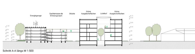 Der Strom kann für das Beladen von Elektroautos oder E-Bikes genutzt werden. Ein Teil des obersten Decks ist als begrünte Erholungsfläche der Büronutzer gedacht. Die grüne Energiegarage ist ein von weitem sichtbares Signet und Ausdruck für den Aufbruch in ein neues nachhaltiges Zeitalter!