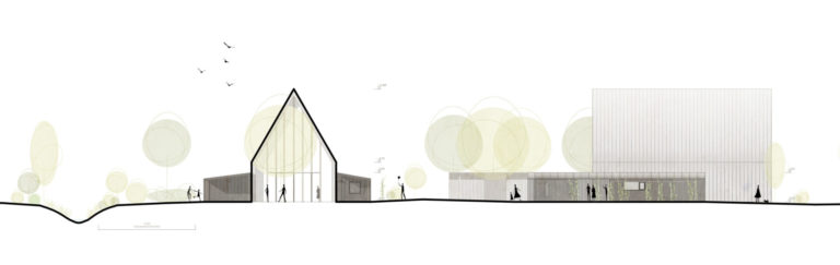 Der zweite Entwurfsgedanke ist der Hof. Ergänzend zum Gemeindesaal werden zwei Riegel links und rechts des Hauses ausgebildet, die die Richtung des Hauptdaches aufnehmen. Durch die Ausbildung der beiden Riegel entsteht ein Hof, der mehrere Funktionen übernimmt: Zum einen das Ankommen der Gemeindemitglieder, der Gäste bei Festen als auch der zufällig vorbeikommenden Besucher. Es wird eine Vorzone vor dem Eingang gebildet, die die Menschen einlädt, anzukommen und einzutreten. Zum anderen das Verteilen. Neben dem Haupteingang zum Foyer und Gemeindesaal ist auch der Liefereingang zur Küche vom Hof aus zu erreichen. Ein zusätzlicher Nebeneingang für den Gruppenraum ermöglicht es, den Saal und den Gruppenraum getrennt voneinander zu nutzen. Trotz der zentralen Lage des Pfarramtes für die leichte Auffindbarkeit, wird die notwendige Privatsphäre für seelsorgerliche Gespräche geschaffen, indem das Pfarramt leicht vom Gruppenraum + Sanitärbereich abgerückt ist, wodurch ein dem öffentlichen Bereich abgewandter Vorbereich erzeugt wird. Wird dies nicht gewünscht, kann das Pfarramt problemlos (ohne auf den separaten Eingang zum Gruppenraum verzichten zu müssen) an das Gebäude gerückt werden.