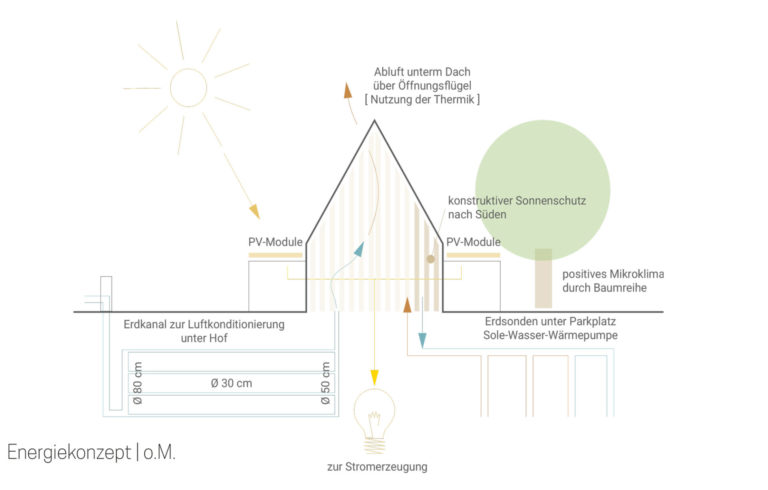 Für die Energieversorgung ist eine Sole-Wasser-Wärmepumpe unter den Parkplätzen im Süd-Osten des Gebäudes vorgesehen. Über PV-Module auf den seitlichen Riegeln wird diese mit der benötigten Energie versorgt. Über einen Erdkanal, der unterhalb des Hofes verlegt wird, soll die Zuluft vorkonditioniert werden. Im Saal wird die Thermik durch die Höhe des Raumes unterstützt und die Luft im Dachspitz über Öffnungsflügel abgeführt. Nach Süden sorgt ein konstruktiver Sonnenschutz aus Holzelementen für den nötigen Wärmeschutz.