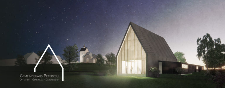 Das Haus als Archetyp stärkt als Blickfang den Ortseingang von Peterzell und lenkt mit seinem prägnanten Dach den Fokus auf die Peterzeller Kirche. Die Dachform, ein einfaches Satteldach, stellt eine Beziehung zu dem Dach der Kirche her. Gleichzeitig fügt sich das Dach mit seiner Längsausrichtung entlang des Baches in die Umgebung und die vorhandene Natur ein. Das Haus steht mit seinem Dach und der einfachen Form für Geborgenheit, Schutz und Heimat.