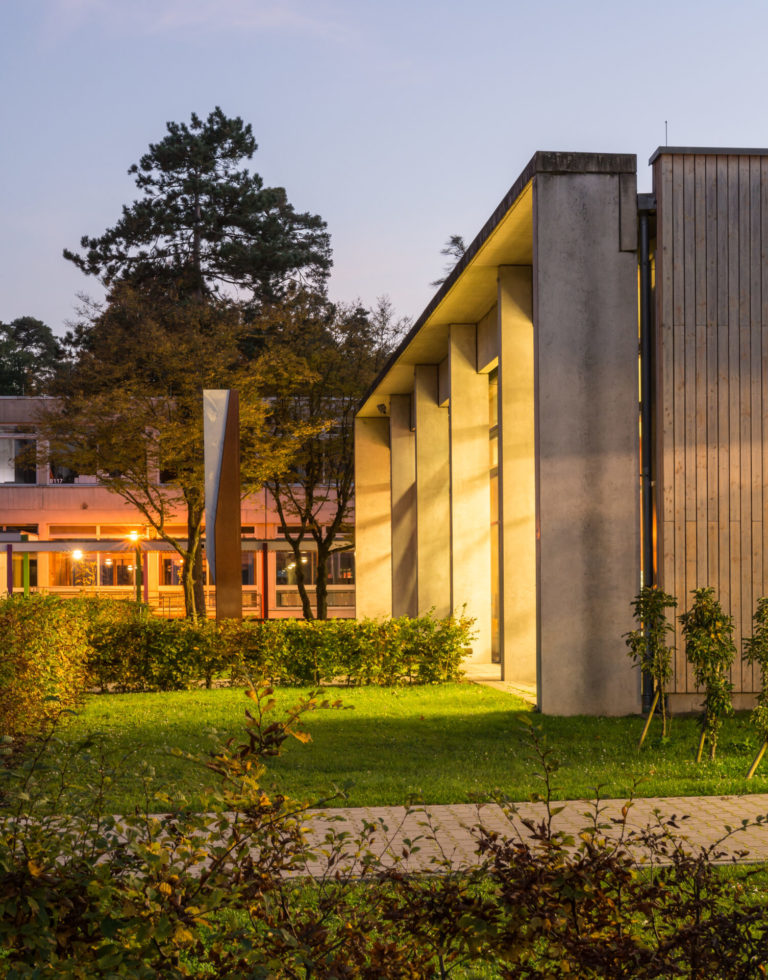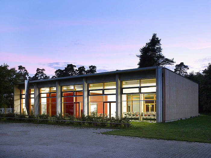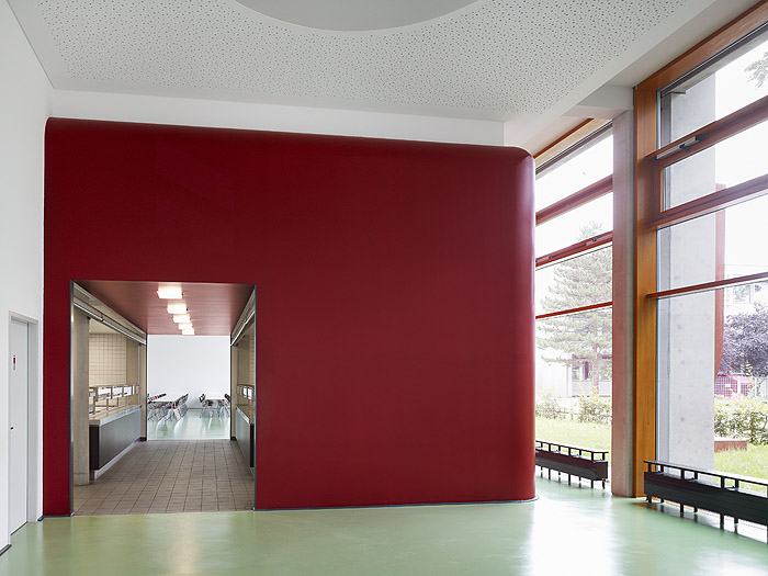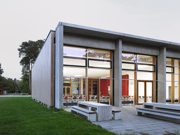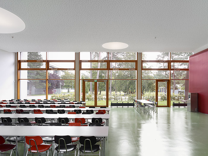 Das gemeinsame Essen ist eines der kulturell wichtigsten Ereignisse, insbesondere für Kinder. Die Mensa soll, obschon als großer, stützenfreier Raum gefordert, dennoch ein Ort sein, der sich von einer Kantine unterscheidet. Die Voraussetzungen sind durch die Besonderheit des Ortes – am Ende des von drei Seiten umstandenen Schulinnenhofes – ideal. Um diesen Freibereich nicht nach Westen abzuriegeln war es ein zentraler Gedanke die Funktionsräume und den Zugang an der Südseite, an dem sich auch die Pergola befindet, anzuordnen, um Platz zu lassen für einen fast vollverglasten Speisesaal, der eine visuelle Ost-West-Beziehung zulässt. Die Südwand ermöglicht eine Erweiterung des Gebäudes nach Süden. Energetisch nutzt das extrem gedämmte Gebäude die Rücklauftemperatur der Heizung des Schulgebäudes.