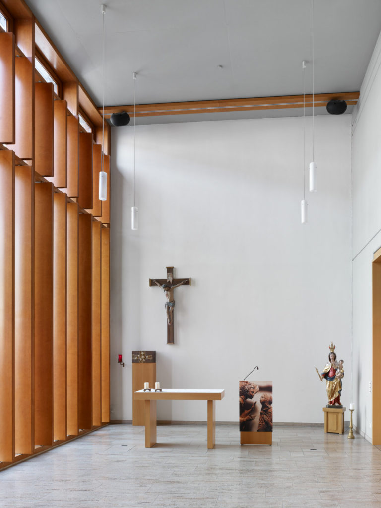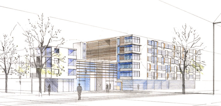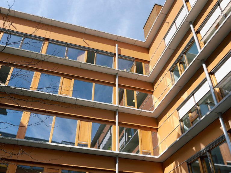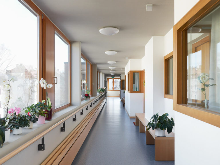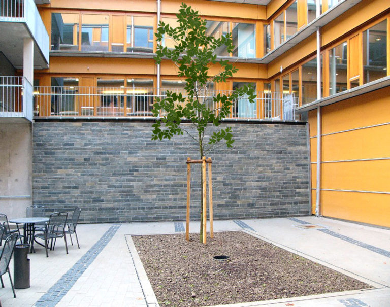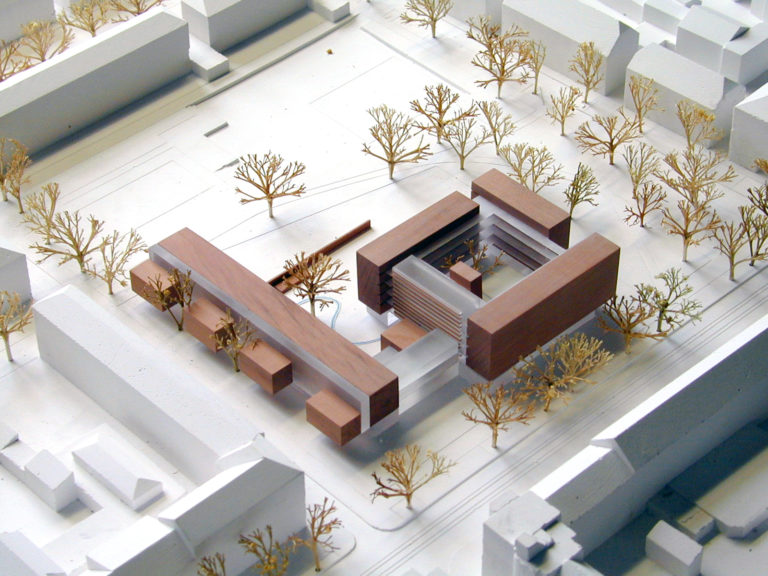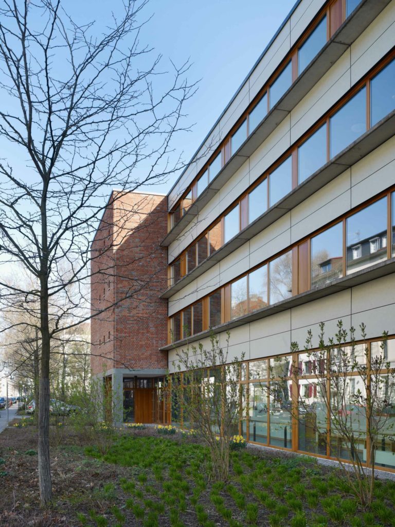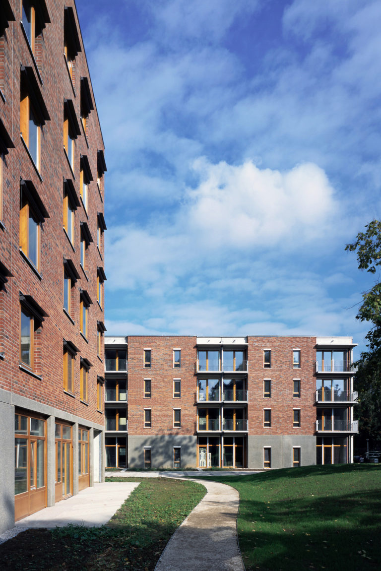 In zentraler Stadtlage, entlang eines innerstädtischen Grünzuges gelegen, stellt sich das Pflegezentrum den architektonisch-funktionalen Aspekten der Pflege alter und demenzerkrankter Menschen. Der Neubau sollte nicht wie ein Fremdkörper wirken, sondern den Eindruck vermitteln schon lange hier zu stehen und den Bewohnern über die erhaltenen, hohen Bäume das Spiel der Jahreszeiten sowie von Wind und Wetter auch vom Bett aus erfahrbar machen. Die Gebäudefluchten, die Eingangssituation und die Höhenentwicklung reagieren sensibel auf den Ort. Während das Gebäude an der breiten Rüppurrer Straße sechsgeschossig ist, rückt es an der Luisenstraße mit seinen vier Geschossen weg von der Straße, um den Nachbarn nicht die Sonne zu nehmen. Ausgestattet mit einem Erdkanal und einer kontrollierten Be- und Entlüftung mit Wärmerückgewinnung erfüllt das hochgedämmte Haus höchste ökologische Ansprüche.