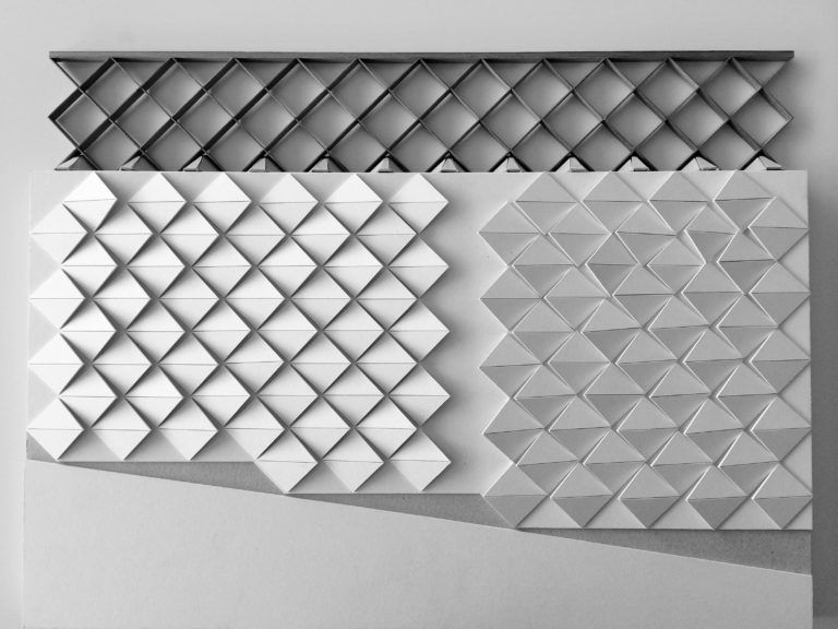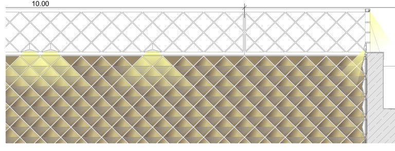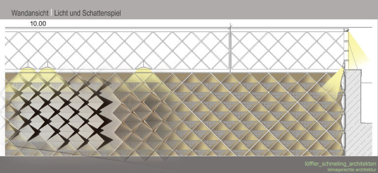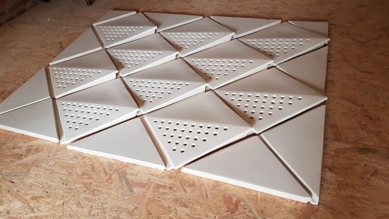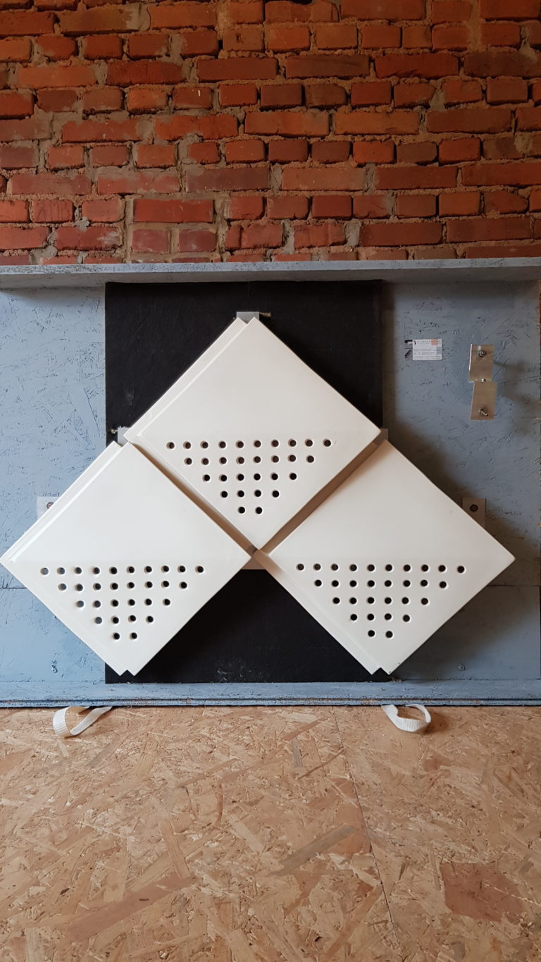Im Hinblick auf die schallabsorbierende Anforderung der Platten wurde zum Beispiel mit unterschiedlich großen Lochungen experimentiert. Die Abmessungen der Platten sowie die Lochung sind entscheidend für die Ästhetik und die Wirkung der Wand. Im Kund’schen Rohr am Prüfstand der Hochschule für Technik Stuttgart in Vaihingen wurden Probekörper der Platten auf ihr Schallverhalten geprüft und haben den Anforderungen entsprochen.