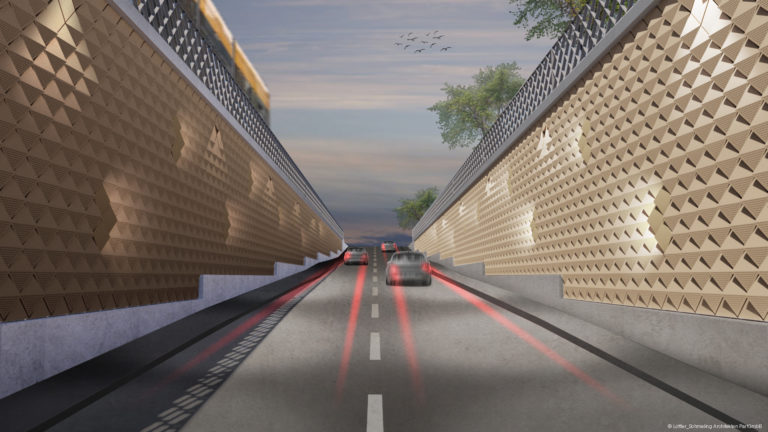 Nachdem der Wettbewerb für die Verkleidung der Tunnelportale gewonnen wurde, entwickelten wir die Schallschutzverkleidung der Tunnelportale weiter. Ebenso entstand ein Entwurf für das Geländer der Tunnel. Die Platten für die Verkleidung wurden in Bezug auf die Materialität, Form und das Absorptionsverhalten weiterentwickelt.