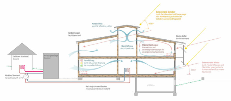 Kern des Konzepts ist es, den Bestand dort, wo er sich umnutzen lässt, zu erhalten. Nur die Bereiche, die sich räumlich und wirtschaftlich nicht in zeitgemäße und zukunftsfähige Räume für die speziellen Bedürfnisse der Pädagogik der Wessenbergschule umbauen lassen, werden abgebrochen. Der Teilabbruch erhält Bausubstanz, die somit nicht erneut erstellt werden muss. Dies spart Kosten und schont wertvolle Ressourcen. Der Neubau wird als Holzbau erstellt und das ganze Gebäude erhält den KfW40 Standard. Auf dem Dach wird eine großflächige Photovoltaik Anlage installiert, die zur weiteren nachhaltigen und klimaneutralen Entwicklung des Gebäudeensembles Mariahof in Hüfingen beiträgt.