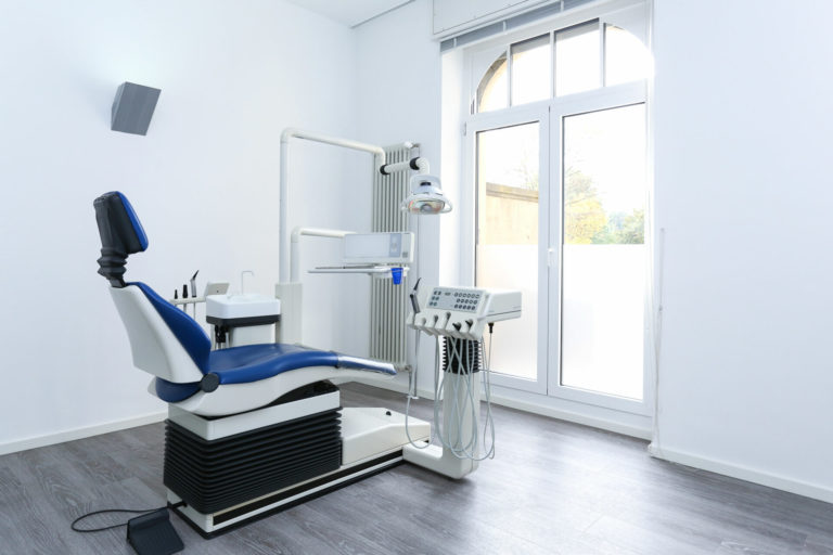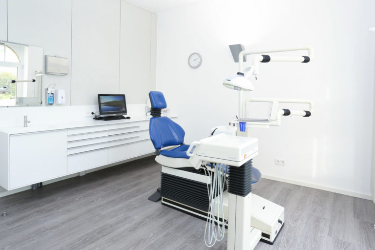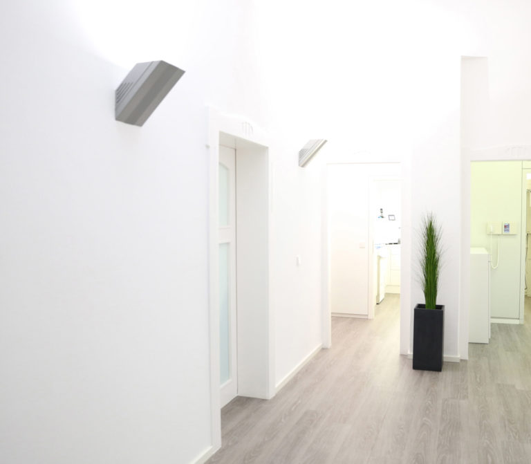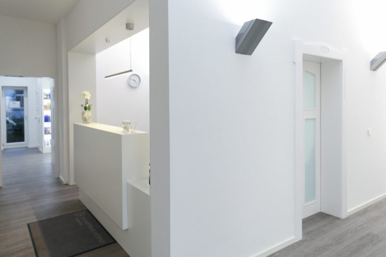 Unsere Aufgabe war es, in relativ kurzer Zeit eine Praxis räumlich, organisatorisch, technisch und vom Mobiliar neu aufzustellen und dabei die engen Grenzen des Denkmalschutzes zu wahren. Es mussten Wände versetzt, Räume neu zugeordnet und ein Wintergarten als Personalbereich angebaut werden. Atmosphärisch sollte die Praxis in Weiß gehalten werden. Die Möbel in den Behandlungszimmern wurden aus hygienischen Gründen wandhängend ausgeführt, um einen leicht zu reinigenden durchlaufenden Bodenbelag zu ermöglichen. Die horizontalen Ablageflächen wurden ebenfalls aus hygienischen Gründen fugenlos aus Corian hergestellt.